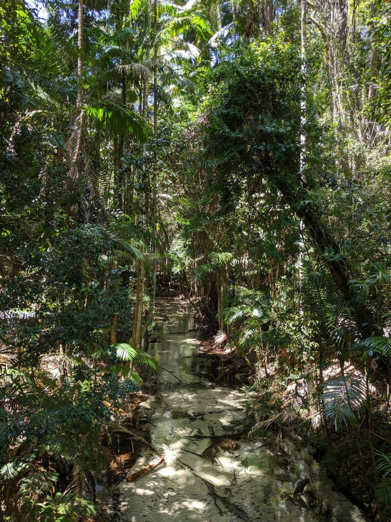 Im Bus erhielten wir Kekse und Orangensaft . Dann ging es los! Auf einen ausgefahrenen Sandweg mit einer guten Spurbreite durch den Regenwald. Ohne Gurt keine Chance am Sitz zu bleiben, die armen Bandscheiben. Trotzdem ein paar Bilder von der Insel.