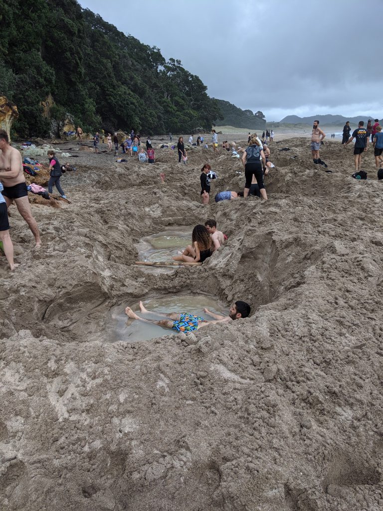 Es begleiteten uns stürmische Winde und gelegentlich Regen. Zuerst ging es an den Hot Water Beach. Lustig anzusehen wie alle versuchen sich einen eigenen Pool zu graben.